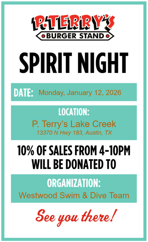Who doesn't love P. Terrys? Order your favorite burger, get those fries, add a cookie and a shake and know that everything you order earns money for our favorite swimmers and divers! This is a long one, from 4:00 pm to 10:00 pm so get your swimmer a pre-training snack AND a full dinner after! Remember to show the flyer below or mention Westwood Swim and Dive for 10% of the proceeds of your order will come back to Westwood Swim and Dive. It will be shared on PeachJar and Socials soon - tell your friends! |